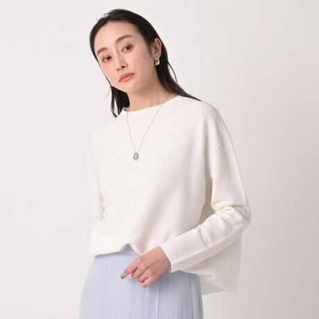 少し立ち上がったワイドボートネックやすっきりとしたストレート袖は