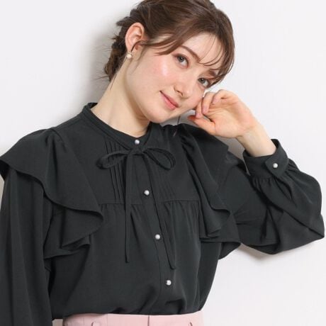 胸元ピンタックと肩フリルがさりげない女性らしさを演出