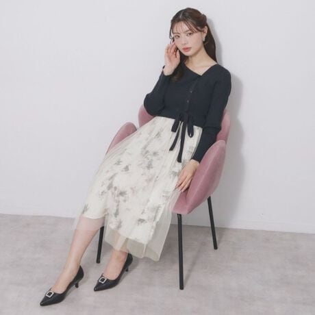 ・軽やかなチュールを重ねた花柄スカートが足元をふんわりと包み込み、品の良い動きを演出。