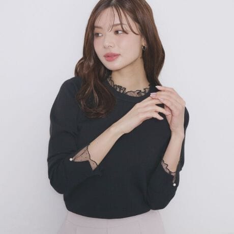 さりげないドットチュールフリルがあしらわれたレイヤードニット