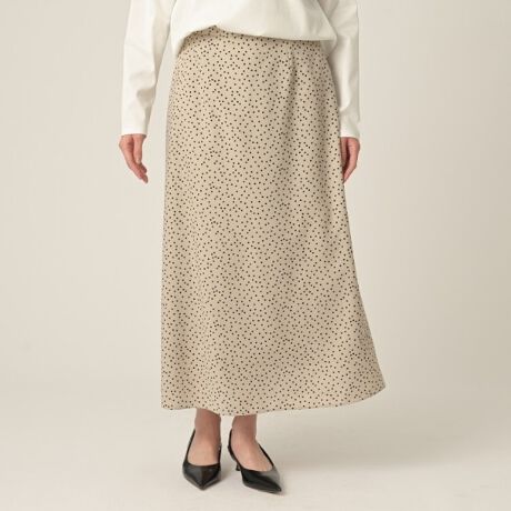 ランダムドット柄が軽やかなアクセントを添え、緩やかなフレアラインが自然に体型をカバーしながら優雅な印象を演出します。