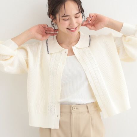 フロントがレース刺繍風デザインの衿付きカーディガン。