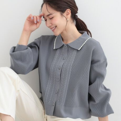 フロントがレース刺繍風デザインの衿付きカーディガン。
