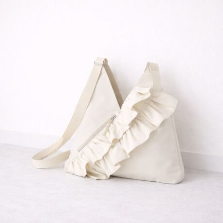 ・アシンメトリーなフリルを効かせた、甘さ控えめの大人モードなデザイン。