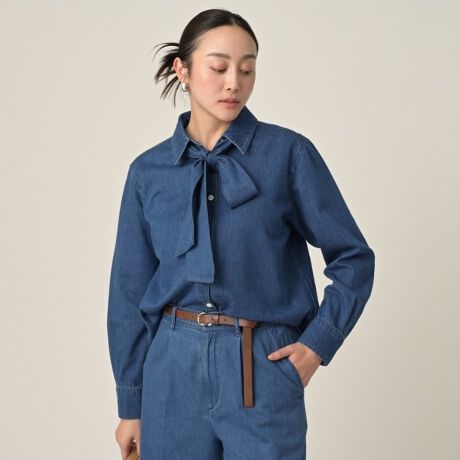 柔らかなデニム素材に、取り外し可能なボウタイがアクセントになった一着。