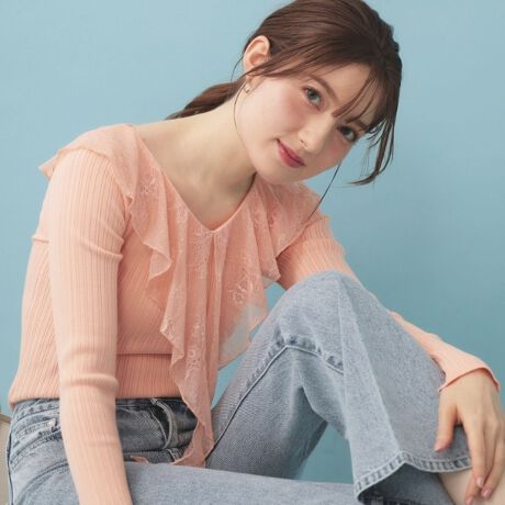 大胆なレースフリルがあしらわれたVネックリブニット