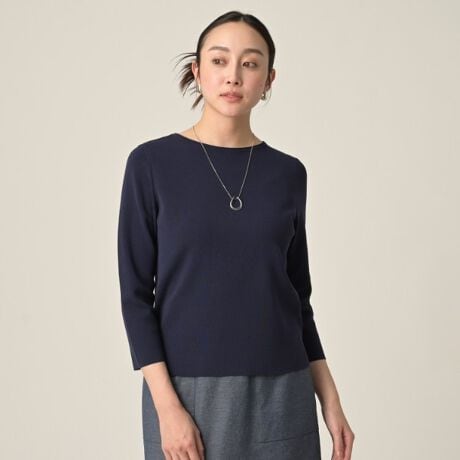 着心地は柔らかでありながら適度なハリ感があり、身体のラインを拾いすぎず、七分袖仕様で程よく肌見せすることで、手首まわりを美しく見せる効果も。