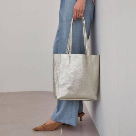 柔らかなレザーに上品なメタリックの艶をまとい、カジュアルながらもリッチな印象です。