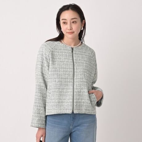 クラシックなツイード素材と、女性らしい柔らかなコクーンシルエットが融合した上品な1着。