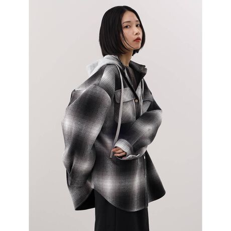 オンブレチェック柄が存在感を放つ、フード付きのシャツジャケット。