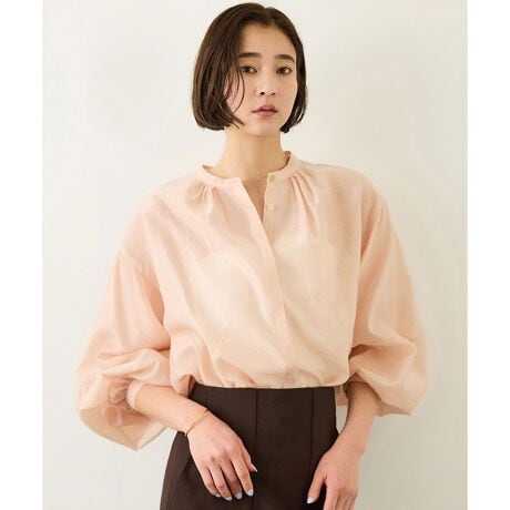 スタンドカラーで袖にボリューム感を持たせた、ややシアーなブラウス。