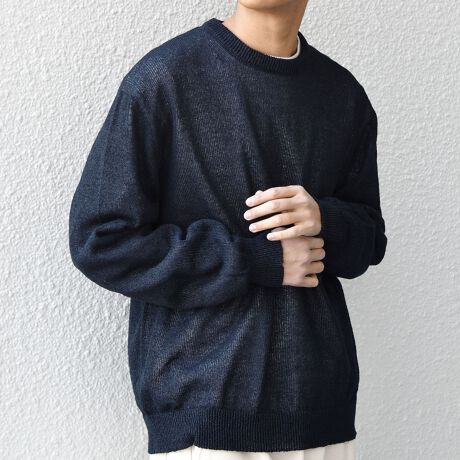 上品且つきれいめな印象でシンプルに使いやすいクルーネックデザインのペーパーヤーンニット。