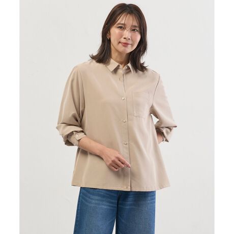 程よいゆとりのあるシャツデザインに、裾のドローストリングでアクセントを効かせたブラウス。裾を軽く絞ることで立体的なシルエットが生まれ、合わせるボトムスとのバランスが取りやすいのが魅力です。前を閉じて1枚で着用しても、軽く羽織りとして使用してもサマになり、きれいめなパンツやスカートとも好相性です。上品なカジュアルスタイルを叶え、シーズンを通して活躍する着回し力の高いアイテムです。カラーは、落ち着きと温もりを感じるモカベージュ(#030)、ナチュラルで軽やかなサンドベージュ(#033)、爽やかさと品を兼ね備えたスモーキーミント(#062)の3色展開です。