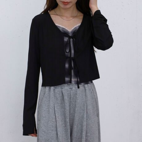 ・カーディガンはフロントリボン仕様で、シンプルながらも女性らしい可愛さをプラス