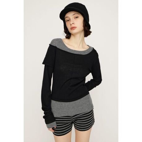 【LAYERED KNIT TOPS】■POINT1枚でレイヤード風のこなれた着こなしが完成するニットトップス。程よい開きのネックラインがデコルテまわりを綺麗に見せてくれます。落ち感のある素材が女性らしい抜け感を演出してくれるアイテムです。■DETAIL天竺とリブの2種類の素材を使用し、レイヤードデザインを表現しました。シンプルながらも1枚で立体感のあるアイテムです。柔らかく伸縮性のある素材が身体に程よくフィットし、身体のラインを拾いすぎずに上半身を華奢に見せてくれます。カットソーのような薄手のニット素材はロングシーズン着用して頂けます。■STYLING定番にデニムやスウェットパンツでラフにまとめるのはもちろん、ミニスカートやロングスカートと合わせれば女性らしいスタイリングが完成します。1枚ではもちろん、アウターのインナーとしても活躍する着回し力抜群のアイテムです。■FABRIC/MATERIAL程よい落ち感のある天竺ニットと程よいハリと伸縮性のあるリブニットを使用。■透け感:部分的にあり■光沢感:なし■伸縮性:なし■裏 地:なし[注意事項]※画像の商品はサンプルです。実際の商品と仕様、加工が若干異なる場合があります。※画像の商品は光の照射や角度、お使いのモニター環境により、実物と色味が異なる場合がございます。※着用、お取り扱いの際は、アテンションタグをご確認ください。※一部予約商品につきましては生産上の都合によりお届け予定日や店頭発売と前後する場合もございます。※追加生産商品は、一部の店舗、通販で販売中の場合がございます。予めご了承下さい。