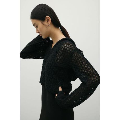 [型番:500JSA70-0801]モデル身長175cm(FREEサイズ着用)カジュアルなフーディーデザインとアイレット柄がキャッチーなニット。袖口に向かって広がる控えめなフレアスリーブが手元にニュアンス感をプラス。一枚ではもちろん、ジャケットの中にレイヤードするとよりこなれた印象に導きます。透け感あり、ストレッチあり。【お手入れ方法】手洗い可
