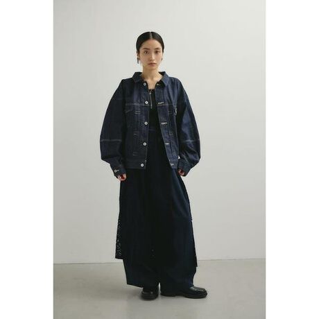 IVO:モデル身長175cm(Mサイズ着用)IDG:モデル身長160cm(Mサイズ着用)オーバーサイズのゆったりとしたフォルムが特徴的なデニムジャケット。ゆったりとしながらも構築的なシルエットで、着るだけで様になる一枚。500JSR11-0901(ダブルウエストデニムスカート)とセットアップ着用可能。透け感なし、ストレッチなし。【お手入れ方法】マシンウォッシュ可※デニムの特性上、着用や洗濯により退色し独特な色変化が生じます。・雨や汗等の湿った状態、着用や洗濯、クリーニングによって他の衣類、雑貨、家具等に色落ちします。・白・淡色との組み合わせは避けて下さい。