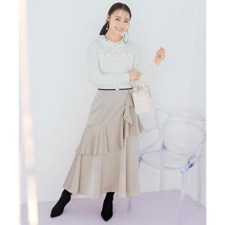 動きのある表情で着映えする、アシメラッフルサテンスカート【Design】・人気のアシメラッフルスカートを、春らしいサテン素材でアップデート。・さらさらと流れ落ちるようなラッフルが、コーディネートに華やかさをプラスします。・アシンメトリーなデザインが、甘さを抑えつつ洗練された印象に。・サテン素材の軽やかさで、スタイリング全体をバランスよくまとめてくれます。・シンプルなトップスを合わせるだけで、スタイリングが決まる主役アイテムです。【Fabric】・上品な光沢感のあるサテン素材を使用。・ベージュ、ピンク、チャコールの3色展開となります。【Care】ドライクリーニング
