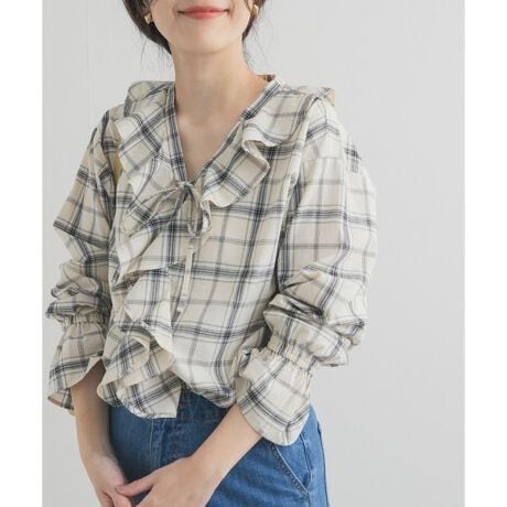 オリジナルのチェック柄を使用した、ナチュラルな雰囲気で着こなせるフリルブラウス。