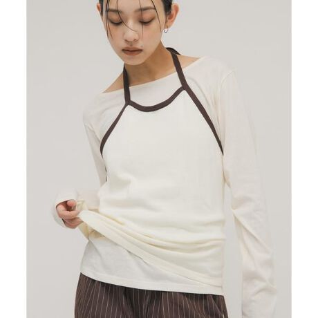 シンプルなロンTEEと、配色デザインがアクセントになったホルターネックビスチェがセットになったアイテム。ロンTEEはデコルテがきれいに見えるよう広めに設定されており、しっかりとした生地を使用したビスチェはロンTEEのみならず、お手持ちのシャツとも好相性です。様々なボトムに合わせやすい2色をご用意しました。