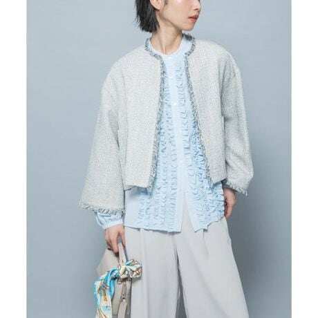 アセテート混ならではの控えめな光沢感が魅力の素材を使用。スタイリング次第でオン・オフ問わず幅広いシーンに対応できる一枚です。フロントにあしらったフリルが華やかさを添えつつ、やや立ち気味のバンドカラーで甘さを抑えた印象に仕上げました。身体のラインを拾いにくい身巾ながら、柔らかな素材感でボトムインもしやすく、ジャケットインやデニム合わせなど多彩な着こなしが楽しめます。