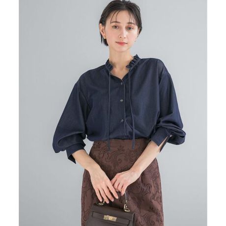 きれいめに着ていただけるデニム素材を目指し、滑らかな面感と程よい落ち感のある生地を選定。カジュアルなデニムが苦手な方にも取り入れやすい一着です。衿ぐりにあしらったフリルとボリュームスリーブが、女性らしい印象を演出。キーネックの程よい開きが抜け感をプラスし、甘さを抑えたバランスに仕上げました。ヒップが隠れる安心感のある丈感に、猫目の貝ボタンを使用することで、きれいめな中にもデニムらしいアクセントをプラス。ボトムを選ばず合わせやすく、今季のトレンドをさりげなくスタイリングに取り入れられるアイテムです。