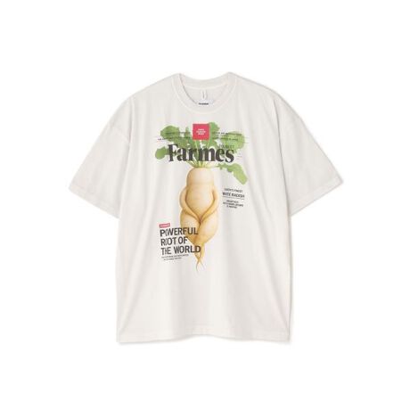 架空のビジネス誌をモチーフに、表紙の主役に選ばれたのは人のように擬人化された野菜たち。まるで経済界を牽引するヒーローのように、にんじんやナスが各々のコメント付きで称えられています。胸にはそんなグラフィックを大胆にプリントした一枚。