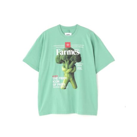 架空のビジネス誌をモチーフに、表紙の主役に選ばれたのは人のように擬人化された野菜たち。まるで経済界を牽引するヒーローのように、にんじんやナスが各々のコメント付きで称えられています。胸にはそんなグラフィックを大胆にプリントした一枚。