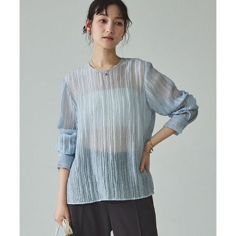 [型番:32520010007]*Detail*光沢の美しい楊柳生地に、さりげないシアー感をプラス。肌に張り付きにくく、軽やかで上品な透け感を楽しめます。一枚でも、ジャケットインでも映える一着です。*Coordinate*テーパードパンツと合わせて、通勤にも使えるきれいめスタイルに。ジャケットのインに入れれば、顔まわりのポイントになります。デニムと合わせても、ラフすぎず品よくまとまります。