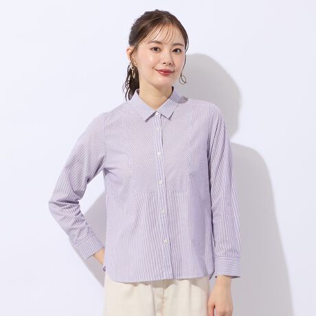 細めのロンドンストライプブラウス。衿元を切り替え、バイアス使いすることでアクセントに。オフィススタイルからデイリースタイルまで幅広い着こなしに合わせられるアイテム。