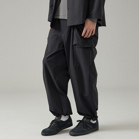 ゆったとりとしたワイドシルエットのパラシュートパンツ。