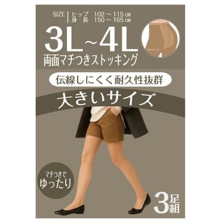 大きいサイズの方のために特別設計された、快適な3L-4Lサイズのストッキング3足組セットです。