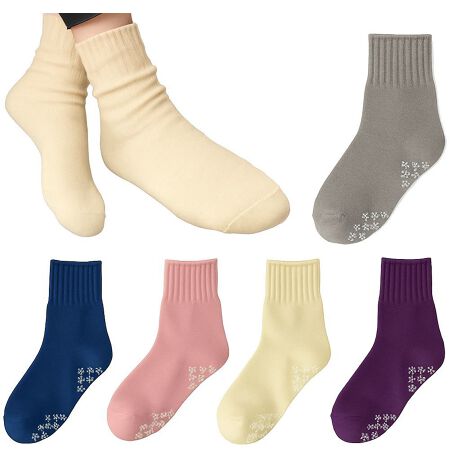 生地はあったかアクリル素材、裏地は裏起毛加工しており、足裏に滑り止めがついていてとても柔らかく暖かいルームソックスです。