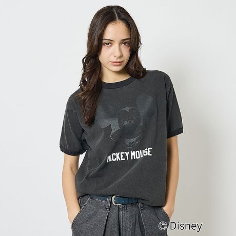 「ミッキーマウス」の愛らしいプリントが施されたリンガーTシャツ。