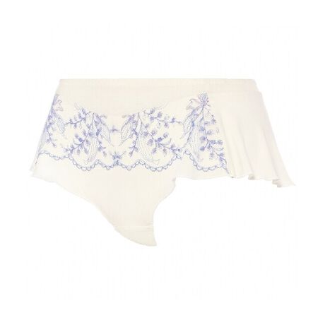 フロントに無地のチュールネットを合わせ、すずらんの刺繍レースにラメ糸がきらめく華やかなデザインです。スカート風のシルエットで可憐なムードが広がり、春らしい華やぎを添えます。