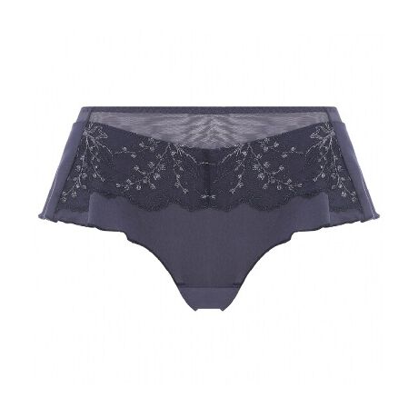 フロントに無地のチュールネットを合わせ、すずらんの刺繍レースにラメ糸がきらめく華やかなデザインです。スカート風のシルエットで可憐なムードが広がり、春らしい華やぎを添えます。