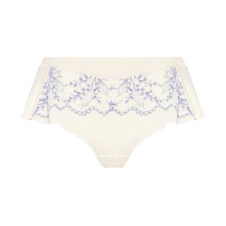 フロントに無地のチュールネットを合わせ、すずらんの刺繍レースにラメ糸がきらめく華やかなデザインです。スカート風のシルエットで可憐なムードが広がり、春らしい華やぎを添えます。