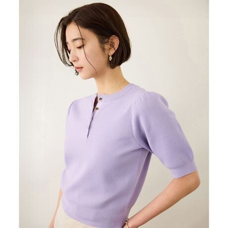 気になる二の腕を上品にカバーする5分袖と、程よく体にフィットするコンパクトなシルエットが、女性らしくクリーンな印象を与えます。