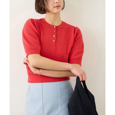 気になる二の腕を上品にカバーする5分袖と、程よく体にフィットするコンパクトなシルエットが、女性らしくクリーンな印象を与えます。