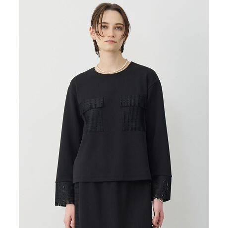 ■デザインラッセルレースの切り替えデザインがポイントのジャージートップスです。胸ポケットとカフスにラッセルレースを使用し、上品なデザインに仕上げました。身幅のあるシルエットながらコンパクトな丈感ですっきりとした印象です。様々なボトムと好相性で単品使いはもちろん、同シリーズのナロースカートとのセットアップ着用もおすすめです。きれいめなデザインでお仕事にも、幅広いシーンで着られる一枚です。