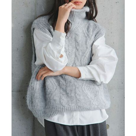 トレンドのシアーインナーと合わせて着たい、ケーブル編みハイネックニットベスト。
