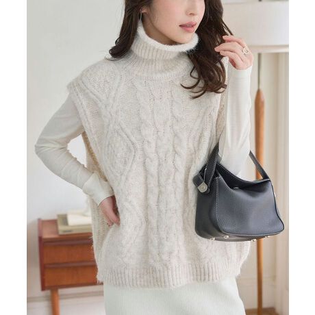 トレンドのシアーインナーと合わせて着たい、ケーブル編みハイネックニットベスト。