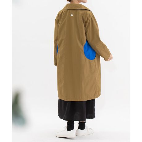 軽いナイロンタフタ生地を重ねた、リバーシブル仕様のコート。ポケットの配色の丸い切り替えがデザインアクセントになっています。背中にはスワン刺繍を施し、さりげないポイントに。裏側は鮮やかなカラーリングで、大きなパッチポケットとスワンネームのデザインになっています。衿はボタンを留めて立てても、折り返しても着用可能。撥水加工(効果は徐々に低下します)を施していて軽い雨の時にも便利です。