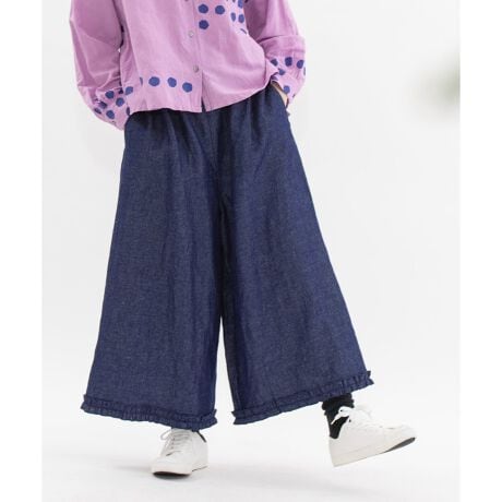 裾フリルの8分丈パンツ。きれいに広がるAラインシルエットです。スポーティーな光沢感のあるブラック・ネイビーの無地と、ナチュラルなデニムの2素材の展開。右後ろのスワンネームやサイドの配色三角ステッチ、両サイドポケットのスカラップステッチなどもさりげないアクセントを効かせています。ウエストはゴム仕様で、内紐つき。