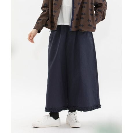 裾フリルの8分丈パンツ。きれいに広がるAラインシルエットです。スポーティーな光沢感のあるブラック・ネイビーの無地と、ナチュラルなデニムの2素材の展開。右後ろのスワンネームやサイドの配色三角ステッチ、両サイドポケットのスカラップステッチなどもさりげないアクセントを効かせています。ウエストはゴム仕様で、内紐つき。