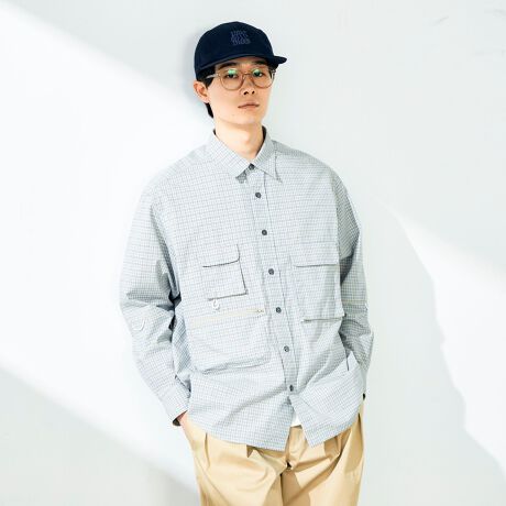 #GLOSTER #フィッシングシャツ #多ポケットシャツ #アウトドアミックス #ギア系ファッション #チェックシャツ #シャツ羽織り #ライトアウター #春夏コーデ #フェスコーデ #レイヤードスタイル #ユニセックス