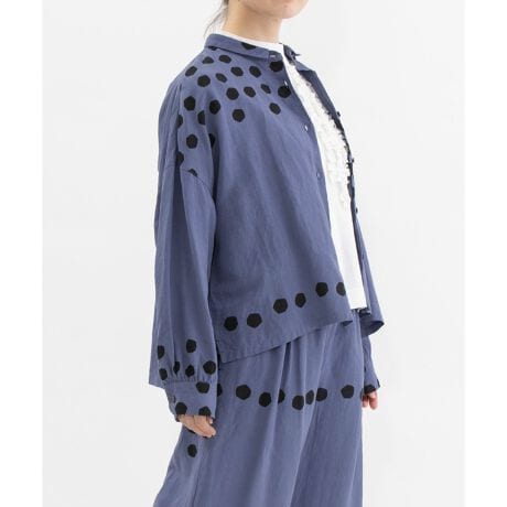 角張ったドット柄を、大きなボーダー状に並べたオリジナルパネルプリントで仕立てたシャツ。リネンの節の素材感で、カジュアルかつヴィンテージライクな軽く透け感のある生地を使用しています。ワイドなスクエアー型でサイドが垂れるこなれシルエット。短めでバランスがよく合わせやすい、後ろが長めの前後差デザイン。開けた時にちらりと見える配色ステッチもポイントです。
