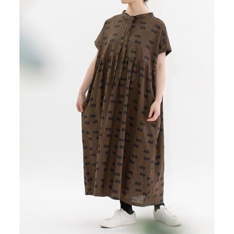 ドットを二つ並べたレトロな雰囲気のオリジナル生地で仕立てたジャンスカワンピース。ざらっとしたナチュラルな風合いの軽いリネンコットン生地で、スタンドカラー続きの長いボーカラーが特徴で前後どちらでも楽しめる2way仕様です。両サイドポケットつき。