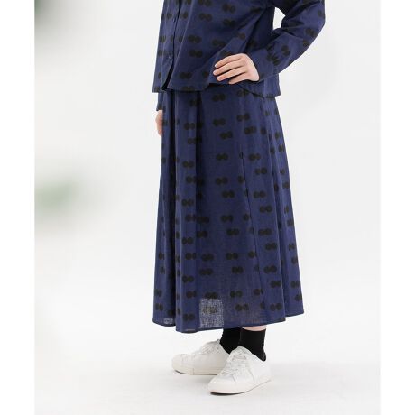 ドットを二つ並べたレトロな雰囲気のオリジナル生地で仕立てたタックギャザースカート。ざらっとしたナチュラルな風合いの軽いリネンコットン生地で、大きなパッチポケットがアクセント。ウエストはゴム仕様でベルトは配色使いになっています。