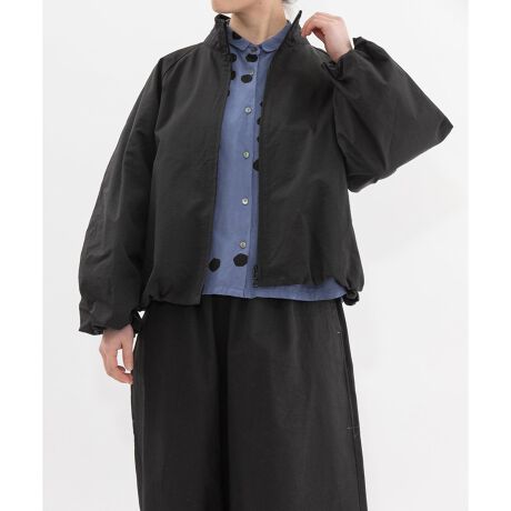 裾と袖口にボリュームを持たせた、エレガントな甘さも感じるバルーンシルエットのブルゾン。トレンドのスポーツテイストミックスコーデにも活躍します。スポーティーな光沢感のあるブラック・ネイビーの無地と、ナチュラルなデニムの2素材の展開。裾はストッパー仕様でシルエット調整が可能。袖口はゴム入りで、丸みのあるフォルムをキープします。背中にはスワン刺繍を施し、さりげないアクセントに。